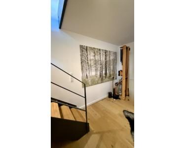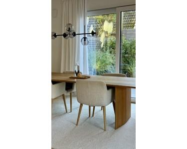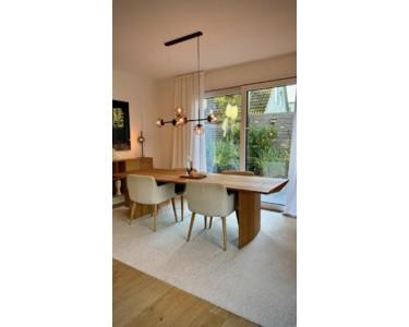 Das Haus steht als Endhaus in einem kleinen Vierer-Ensemble und wirkt durch seine offene Gestaltung sofort großzügig. Hohe Decken, große Fensterflächen und eine durchgehende Eichentreppe im Industriestil verbinden alle Etagen. Geölte Eiche und Natursteinfliesen setzen den warmen, modernen Akzent.