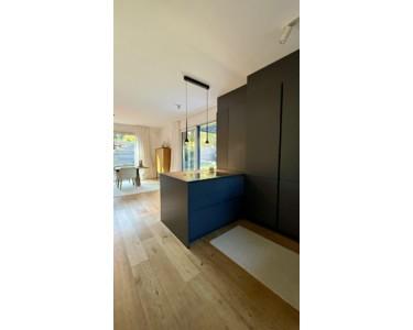 Offener Wohn- und Essbereich mit direktem Zugang zur Terrasse und zum Garten. Die moderne Einbauküche in Anthrazit matt ist hochwertig ausgestattet. Bodentiefe Fenster geben viel Licht und öffnen den Blick in den Außenbereich. Zusätzlich gibt es ein Gäste-WC sowie einen separaten Garderobenraum.