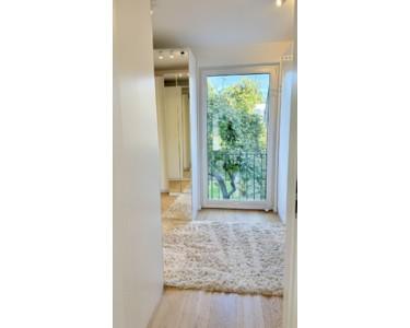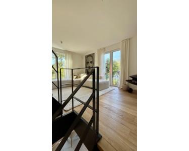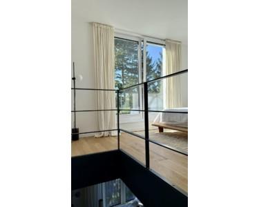 Heller Schlafbereich mit Zugang zur Dachterrasse. Auf derselben Ebene befindet sich ein großes Duschbad mit bodentiefem Fenster und WC. Schlafen und Bad bilden hier eine private Etage.