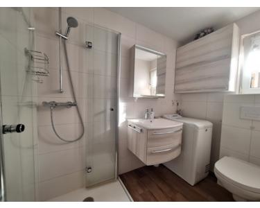 Das Schlafzimmer und das modern geflieste Duschbad gehen jeweils von der Küche ab. Das Bad wurde im Jahr 2000 komplett saniert und mit hellen großformatigen Wandfliesen ausgestattet. Als Kontrast ist der Fußboden in einem dunklen Holzton (Fliesen) gehalten. Eine Waschmaschine findet hinter dem bereits vorhandenen Waschtisch ihren Platz und für warme Füße am Morgen sorgt die Fußbodenheizung.