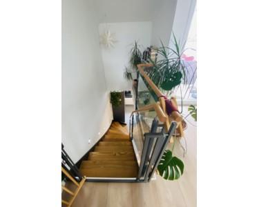 Von der Küche aus gelangen Sie über eine schöne beleuchtete Holztreppe mit Stahlwangen in das Wohnzimmer.