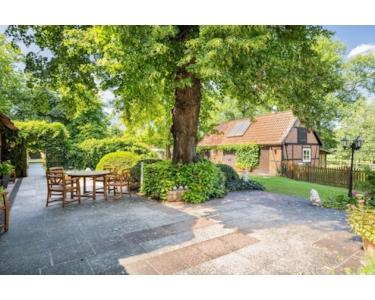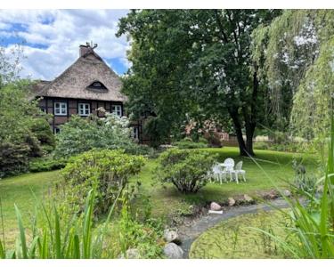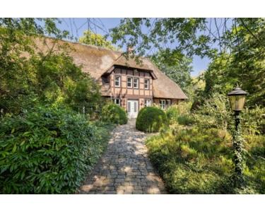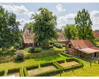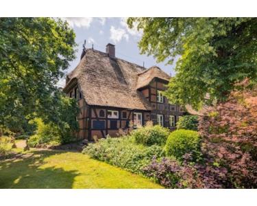 Haupthaus aus Eichenfachwerk mit Verblendausmauerung, Holzbalkendecken, Holzfenster, Holztreppe, Reetdach, Marmorböden im kompletten Erdgeschoss