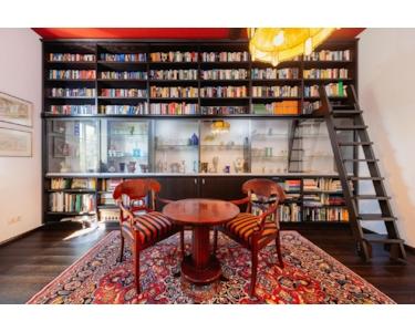 + Wunderschöne und imposante Bibliothek mit eingebauten Bücherregalen, raumhohen Glasvitrinen, Billardtisch und hochwertigem Parkettboden im Dachgeschoss.