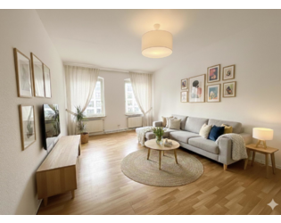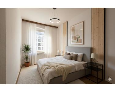 Die separate Küche bietet ausreichend Platz zum Kochen und ist praktisch angeordnet. Mit direktem Zugang zum westlich ausgerichteten Balkon – perfekt, um abends die Sonne zu genießen. Das Schlafzimmer ist ruhig gelegen und bietet Raum für ein komfortables Wohngefühl. Es handelt sich beim Wohnzimmer und Schlafzimmer um ein maßstabsgetreues Foto, das mit KI bearbeitet wurde. So oder ähnlich könnte der Raum nach erfolgter Renovierung und mit neuer Ausstattung aussehen.