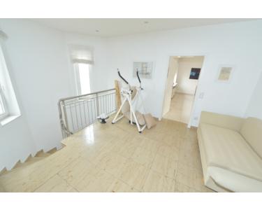 Das Obergeschoss beherbergt neben den Schlafzimmern und Bädern auch einen weiteren großzügigen Wohnbereich, der sich ideal als Bibliothek oder Arbeitszimmer eignet. Die Verwendung von Marmor setzt sich auch hier fort und verleiht den Räumen eine exklusive Note.