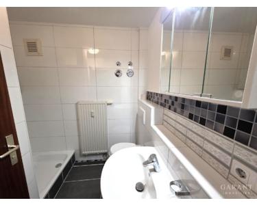 Das separate Schlafzimmer bietet ausreichend Platz für ein großes Bett sowie weitere Möbel. Das Badezimmer, zwar ohne Fenster, überzeugt dennoch mit modernen Fließen und einer praktischen Raumaufteilung.