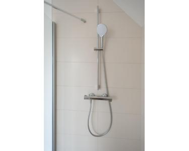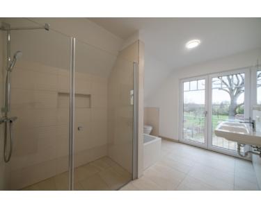 Eine Buchenholztreppe führt Sie ins OG. Zwei Tageslichtspots erhellen hier das Treppenhaus und die Galerie energiesparend. Außer dem Hauptbad mit Dusche, Wanne mit toller Aussicht über die Felder gibt es im OG noch ein weiteres Bad mit Dusche. Wir haben es "Kinderbad" genannt. Wer schon mehrere Kinder hat, weiß das zu schätzen.