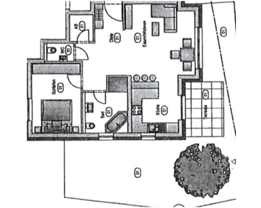 Der Grundriss ist funktional und zeitgemäß gestaltet. Die Wohnung verfügt über ein Schlafzimmer, eine separate Abstellkammer, einen offenen Wohn-/Koch-/Essbereich mit direktem Zugang zur Terrasse sowie einen kleinen, zugeordneten Gartenanteil. Ergänzt wird das Raumangebot durch ein Badezimmer mit Badewanne und Dusche sowie ein separates Gäste-WC.
