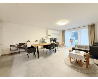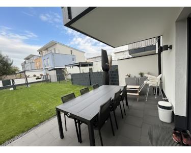 Diese moderne 3-Zimmer-Erdgeschosswohnung aus dem Baujahr 2019 überzeugt mit einem großzügigen, lichtdurchfluteten Wohn-/Essbereich mit Platz für eine offene Küche, zwei gut geschnittenen Schlafzimmern sowie einem stilvollen Bad mit bodengleicher Dusche und Wanne; ein separates Gäste-WC rundet den Grundriss ab. Große Fensterfronten, großformatige Feinsteinzeugfliesen und Fußbodenheizung schaffen ein angenehm zeitgemäßes Wohnambiente. Vom Wohnbereich geht es direkt auf die weitläufige Terrasse mit angrenzender Rasenfläche ideal für den ersten Kaffee am Morgen oder entspannte Abende im Freien. Vor dem Einzug werden alle Wände frisch weiß gestrichen, die vorhandene Einbauküche verbleibt nicht, sodass Sie Ihre eigene Küchenplanung frei umsetzen können. Praktisch sind die zur Wohnung gehörende Garage und der zusätzliche Abstellraum im Dachgeschoss. Insgesamt präsentiert sich die Wohnung in sehr gepflegtem, nahezu neuwertigem Zustand perfekt für Singles, Paare oder die kleine Familie, die ebenerdiges Wohnen mit hochwertigen Details und schönen Außenflächen schätzen.