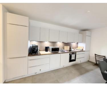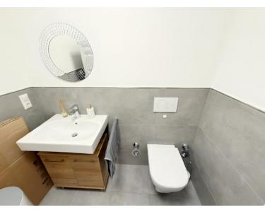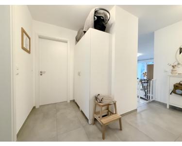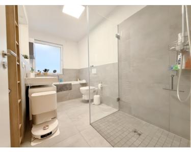 Die Wohnung bietet eine moderne, gepflegte Ausstattung: großformatige Feinsteinzeugböden, Fußbodenheizung und breite Fensterflächen für viel Licht. Das Bad ist hochwertig mit bodengleicher Dusche und Wanne, zusätzlich gibt es ein Gäste-WC. Vor Einzug werden alle Wände frisch weiß gestrichen. Draußen überzeugt eine großzügige Terrasse mit Rasenanteil. Zur Wohnung gehören außerdem eine Garage sowie ein Abstellraum im Dachgeschoss; die vorhandene Einbauküche verbleibt nicht.