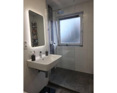 Das 6 m² große Badezimmer ist vom Boden bis zur Decke gefliest. Es verfügt über eine stilvolle und geräumige Dusche, eine Waschmaschine und einen Spiegelschrank mit verstecktem Stauraum für alles Notwendige.