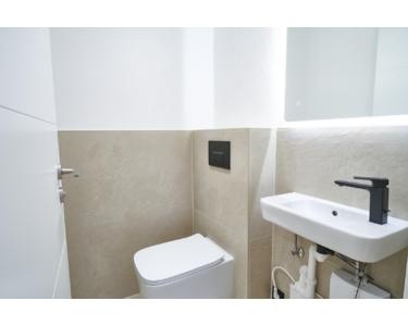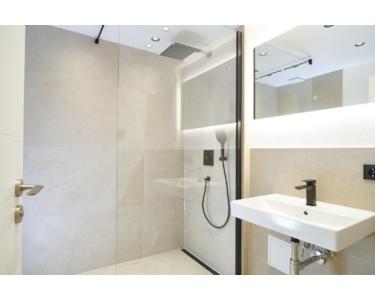Das Badezimmer präsentiert sich als Wohlfühloase: Große, nahezu bodengleiche geflieste Dusche mit Regendusche und Badkeramik von Villeroy & Boch sowie neue Sanitärinstallationen inklusive eigener Absperrhähne und Wasserzähler.