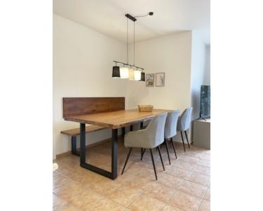 Ein großer moderner Essplatz wurde direkt auf dem Weg zwischen Küche und Wohnbereich angelegt. Das ist praktisch und sorgt für kurze Wege und rege Kommunikation!