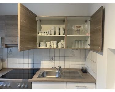 Die für eine Ferienwohnung relativ große Einbauküche verläuft im rechten Winkel mit einem Hochschrankelement und Unterschränken unterhalb des Fensters über die gesamte Südseite und mit Unter- und Oberschränken über die gesamte Westwand des Raumes.