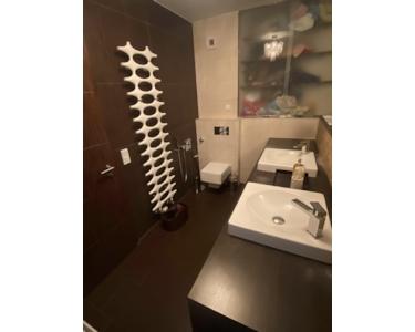 - 2 Designerbädern mit großer Badewanne bzw. bodentiefer Dusche mit Echtglas-Duschtrennwänden, Toiletten, (doppelten) Waschbecken, Dusch- und Waschtischarmaturen von Hansgrohe sowie Design-Handtuchheizkörpern