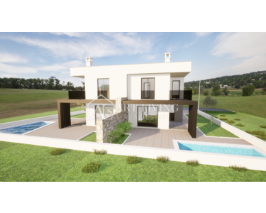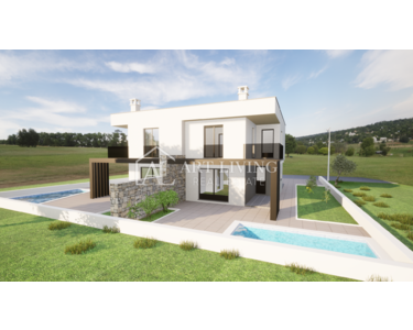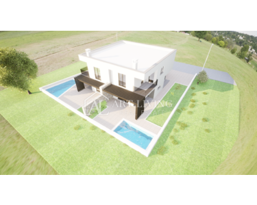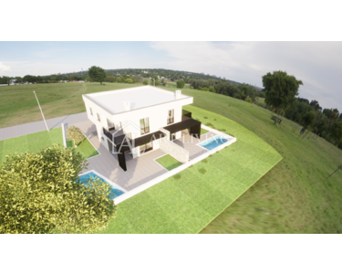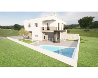 Eine Doppelhaushälfte mit Pool in einem modernen Neubau steht zum Verkauf. Die Villa liegt 3.500 m vom Zentrum von Umag und dem Meer entfernt und bietet einen herrlichen Blick auf die Umgebung und die Landschaft.