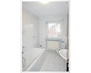 Im hell gefliesten Badezimmer befindet sich eine Badewanne, Dusche, Waschmaschinenanschluss und ein Fenster.