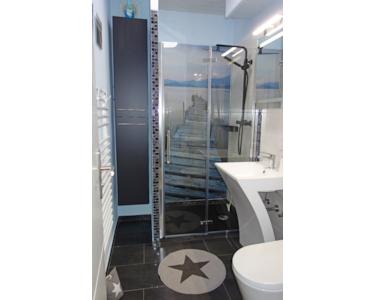 Das Highlight dieses Badezimmers aber ist zweifellos der Duschbereich mit einer tollen Aussicht, einem beeindruckenden Foto hinter Glas, welches den Raum optisch noch vergrößert und auf jeden Fall für ein ungewöhnliches Duschgefühl sorgt!