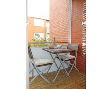 Ab den Mittagsstunden kann man hier die Sonne genießen. Schlichte Sichttschutzelemente nach links sowie der darüber liegende Balkon verleihen diesem gemütlichen Plätzchen ausreichend Sicht- und Windschutz.