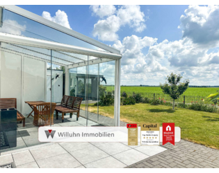 Der Garten ist eine kleine Wohlfühloase. Neben einem großen Schuppen für Gartengeräte finden Sie hier eine unterirdische Regenwasserzisterne mit einem Fassungsvermögen von etwa 6.000 Litern, die die Pflege der Grünflächen erleichtert. Der Blick ins unverbaute Umland vermittelt Ruhe und Naturverbundenheit, perfekt für entspannte Stunden im Freien.