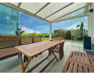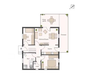 Schon beim Betreten empfängt Sie ein heller Flur, von dem alle Räume bequem erreichbar sind. Mittelpunkt dieser Etage ist das großzügige Wohnzimmer, das mit seiner direkten Verbindung zum Wintergarten besticht. Dieser lässt sich an zwei Seiten komplett öffnen und verwandelt sich so im Handumdrehen in eine weitläufige Terrasse.