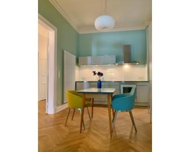 Ein Highlight sind die 3,50 m hohen Decken mit prachtvollem Stuck und Rosetten, die der Wohnung einen herrschaftlichen Eindruck verleihen. Bei sämtlicher Ausstattung wurde auf hochwertige Materialen und stilvolles Design gesetzt: Duravit-Sanitärausstattung, Zehnder Heizkörper, Bulthaup-Küche mit Granit-Arbeitsplatte, Wandfarben von Farrow&Ball und Little Greene.