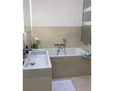 • Verlegung von hochwertigem Vollholz-Parkett aus Eiche in Wohnräumen, Flur und Küche, Fliesen in Badezimmer und WC