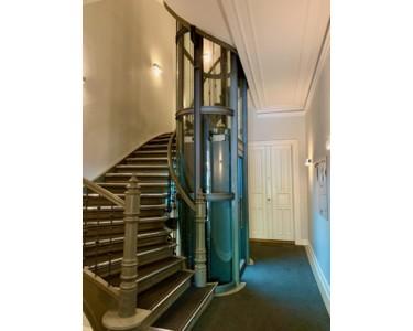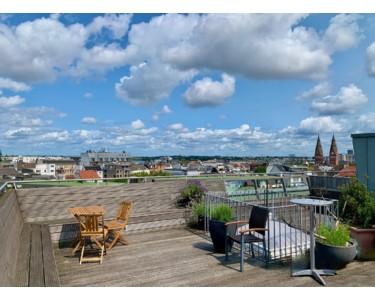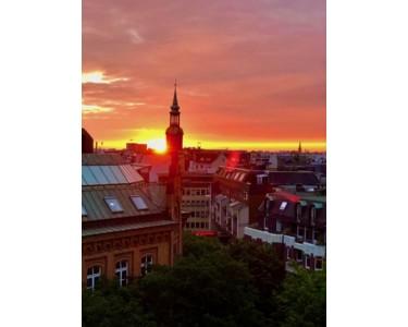 Die ca. 49 qm große gemeinschaftliche Dachterrasse ist ein weiteres Highlight und bietet einen einzigartigen 360°-Blick über Hamburg. Hierhin gelangen Sie bequem mit einem gläsernen Fahrstuhl oder über die imposante, historische Treppe.