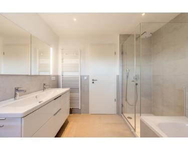 Eine moderne Luft-Wasser-Wärmepumpe sorgt in Kombination mit der Fußbodenheizung für ein energieeffizientes und angenehmes Raumklima. Elektrische Rollläden im Erdgeschoss, elegante Parkettböden, großformatige Fliesen sowie eine moderne Sanitärausstattung unterstreichen den gehobenen Wohnkomfort.