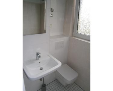 Das helle Tageslichtbad ist mit einem modernen Waschtisch, Hänge-WC und einer Badewanne ausgestattet. Eine Duschabtrennung auf der Badewanne sorgt für zusätzlichen Komfort.