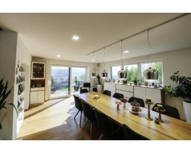 Großzügiger Wohn-/Essbereich mit Panoramaglas und steuerbarem Kachelofen, moderne Einbauküche, drei Zimmer, Gäste-WC. Repräsentativ – ohne laut zu sein.