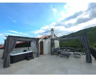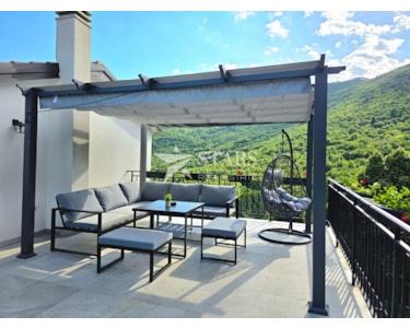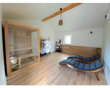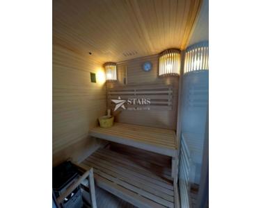 Im Obergeschoss befindet sich ein Raum mit Sauna und Zugang zu einer 54 m² großen Terrasse mit zwei Pergolen, Whirlpool und Sitzgarnitur, die einen offenen und attraktiven Ausblick bietet.