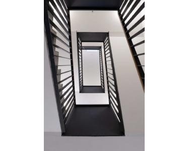 * kompromisslos moderne Treppenhäuser in Sichtbeton, weißer Putz und anthrazit eloxierten Stahl