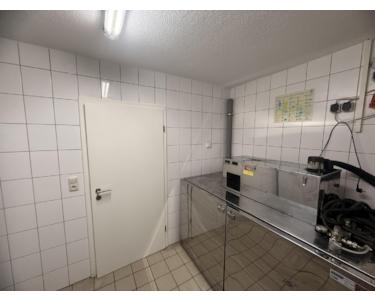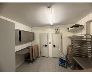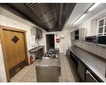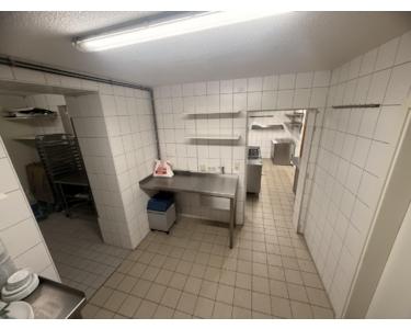 Der Thekenbereich ist zentral angeordnet und funktional nutzbar. Die Küche ist als klassische Gastronomieküche ausgestattet, mit Edelstahlflächen, Kühl- und Lagerräumen sowie einer sinnvollen Wegeführung.