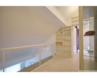 Adjoining the living area is the modern fitted kitchen with large dining table. Lots of daylight enters the room from both sides. The guest room and shower room with WC are on the same storey. A broad staircase takes you to the upper level.