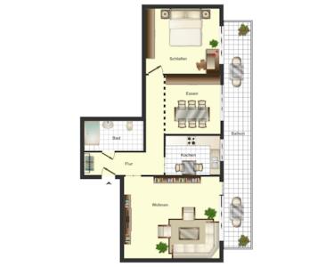 Der Wohnbereich mit Austritt zum XXL-Balkon bildet das Herzstück der Wohnung – hier entspannen Sie auf dem sichtgeschützten Balkon.