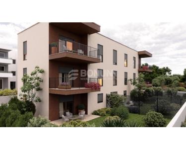Das Gebäude besticht durch modernes Design mit Flachdach, großzügigen Loggien und klaren, zeitgemäßen Linien. Es ist von Grünflächen umgeben und als ruhige Wohnanlage konzipiert. Der Außenbereich ist mit markierten Parkplätzen organisiert, wobei der Fokus auf Privatsphäre und der hochwertigen Ausstrahlung eines Neubaus liegt.