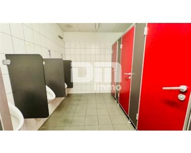 Das EG verfügt über einen Sozialtrakt mit zwei Umkleiden nebst Duschen und Waschräumen, HWR, Herren WCs (4x +4x Urinale), Frauen WCs (4x) sowie Technikraum und zwei abgeteilten Werkstattbereichen mit tragfähigem Dach.