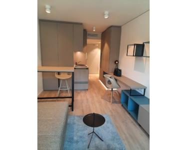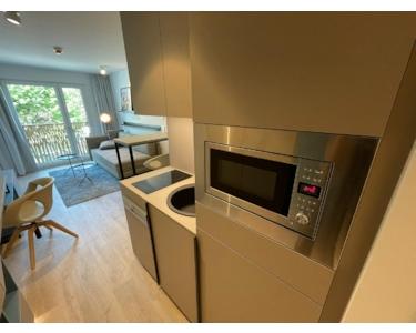 Es ist sehr modern ausgestattet mit Fußbodenheizung und separater Schreibecke sowie Geschirrspüler und Flachbild-TV. Die Küche ist mit einer Grundausstattung an Geschirr und Besteck ausgestattet. Außerdem werden im Haus viele Annehmlichkeiten wie Dachterrasse, Leseecken, Fitnessstudio, Rezeptionsservice u.v.m. geboten.