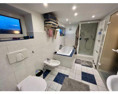 Gegenüber liegt das Badezimmer, ausgestattet mit Badewanne und Dusche. Am Ende des Flures befindet sich das Schlafzimmer; zusätzlich gibt es hier einen abgetrennten Bereich, der sich perfekt als Ankleide nutzen lässt.