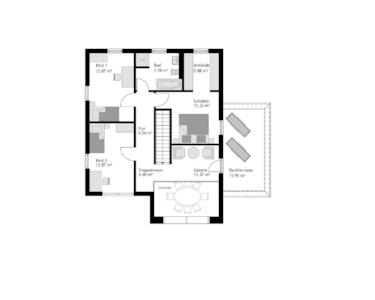 Im Obergeschoss ist die Galerie ein echtes Highlight, die das Gefühl vermittelt, sich in einem großen Wintergarten zu befinden. Von hier aus besteht ein direkter Zugang zur möglichen Dachterrasse, die zum Entspannen einlädt. Ergänzt wird das Raumangebot durch einen Elternschlafbereich mit angrenzender Ankleide, zwei Kinderzimmer und ein geräumiges Familienbad.