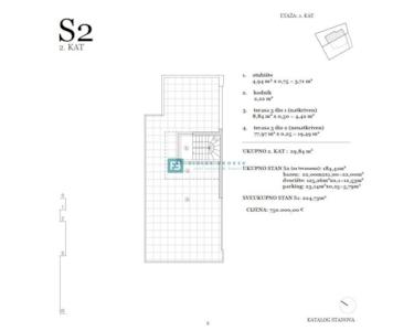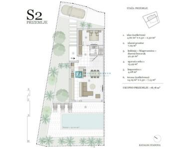 Das Doppelhaus S2 mit funktionaler und großzügiger Raumaufteilung verfügt über 224,73 m2 Netto-Gesamtnutzfläche (184,41 m2 Wohnfläche + 22 m2 Swimmingpool + 125,26 m2 Garten + 23,14 m2 PKW-Stellplatz). Es erstreckt sich über drei Ebenen und besteht aus: Erdgeschoss + 1. Stock + Dachterrasse. Im Erdgeschoss von 78,78 m2 gibt es einen überdachten Eingang, eine Eingangshalle, ein Schlafzimmer, ein Badezimmer, eine Küche mit Esszimmer und ein Wohnzimmer mit Zugang zu einer überdachten Terrasse von 14,29 m2. Eine große Schiebewand bietet einen schönen Blick auf den Garten und den 22 m2 großen beheizten Swimmingpool mit Liegewiese. Eine Innentreppe führt in den 75,87 m2 großen ersten Stock, wo sich ein Flur, ein Hauptschlafzimmer mit eigenem Bad, ein Ankleidezimmer und eine überdachte Terrasse von 12,71 m2, zwei weitere Schlafzimmer und ein Badezimmer befinden. Über die Treppe gelangt man weiter auf die 29,84 m2 große Dachterrasse, die einen wunderschönen Blick auf das Meer und die Umgebung bietet. Es ist mit Wasser- und Stromanschlüssen ausgestattet und kann in eine entspannende Oase mit Whirlpool umgewandelt werden, ideal für den Genuss im Freien. Zum Haus gehört ein Parkplatz.