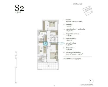 Das Doppelhaus S1 mit funktionaler und großzügiger Raumaufteilung verfügt über 217,90 m2 Netto-Gesamtnutzfläche (174,67 m2 Wohnfläche + 22 m2 Swimmingpool + 105,97 m2 Garten + 42,54 m2 PKW-Stellplatz). Es erstreckt sich über drei Ebenen und besteht aus: Erdgeschoss + 1. Stock + Dachterrasse. Im Erdgeschoss von 79,78 m2 gibt es einen überdachten Eingang, Eingangsbereich + Garderobe, Schlafzimmer, Badezimmer, Küche mit Esszimmer und Wohnzimmer mit Zugang zu einer überdachten Terrasse von 12,04 m2. Eine große Schiebewand bietet einen schönen Blick auf den Garten und den 22 m2 großen beheizten Swimmingpool mit Liegewiese. Eine Innentreppe führt in den 69,87 m2 großen ersten Stock, wo sich ein Flur, ein Hauptschlafzimmer mit eigenem Bad, ein Ankleidezimmer und eine überdachte Terrasse von 10,76 m2, zwei weitere Schlafzimmer, ein Badezimmer und eine nicht überdachte Terrasse von 13,72 m2 befinden. Über die Treppe gelangt man weiter auf die 25,02 m2 große Dachterrasse, die einen wunderschönen Blick auf das Meer und die Umgebung bietet. Es ist mit Wasser- und Stromanschlüssen ausgestattet und kann in eine entspannende Oase mit Whirlpool umgewandelt werden, ideal für den Genuss im Freien. Zum Haus gehören zwei Parkplätze.