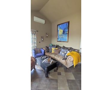 Das Innere des Hauses besteht aus dem Erdgeschoss, wo sich eine große Dreizimmerwohnung mit Küche und Wohnzimmer befindet, die zu einer schönen überdachten Terrasse und zwei Badezimmern führt. Darüber hinaus gibt es ein kleineres Studio-Apartment mit eigener Küche und Bad. Diese beiden Wohnungen verfügen über Fußbodenheizung in allen Badezimmern und Klimaanlagen in allen Zimmern. Eine Außentreppe führt in die 1. Etage, wo sich ein Apartment mit zwei Schlafzimmern und angrenzendem Wohn- und Esszimmer befindet, von dem aus auch Zugang zur Terrasse besteht. Ein Schlafzimmer verfügt über ein eigenes Bad und es gibt ein weiteres Gemeinschaftsbad mit Badewanne. Die Innentreppe führt zur Galerie, wo sich ein kleines Büro mit einer Ausgangsterrasse mit herrlichem Blick auf die Stadt und die Umgebung befindet. Im 1. Stock befindet sich außerdem ein weiteres kleineres Studio-Apartment, das mit einer Küche und einem Badezimmer ausgestattet ist.