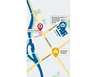 Die BTU ist nur wenige Minuten mit dem Fahrrad oder den öffentlichen Verkehrtsmitteln entfernt und der Altmarkt ist fußläufig zu erreichen.
