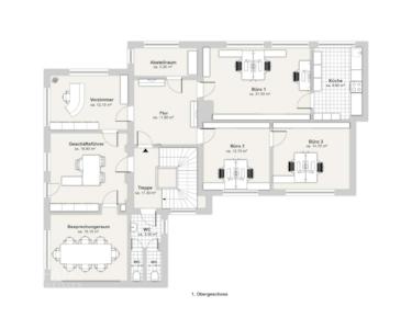 Nach dem Betreten der Räumlichkeiten befinden Sie sich zunächst im Wartebereich. Links finden Sie ein Vorzimmer, das Geschäftsführerbüro sowie ein Sitzungszimmer. Rechts liegen insgesamt drei weitere Büroräume sowie die Küche.