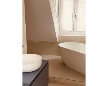 Vom Eingangsbereich im Erdgeschoss erreichen Sie das exklusive Gäste-WC, die Küche sowie den Wohnbereich. Über eine Treppe gelangen Sie in das Obergeschoss – den privaten Bereich. Hier befinden sich das Schlafzimmer mit maßgefertigten Einbauschränken sowie das modern und luxuriös gestaltete Badezimmer en Suite. Dieses ist hell, hochwertig ausgestattet und verfügt über zwei Fenster, eine große Dusche sowie eine Badewanne.