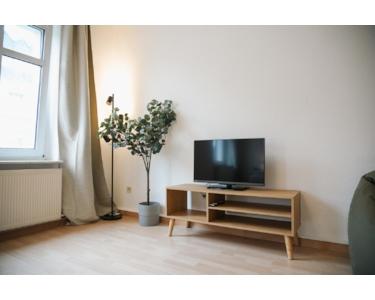 Smart TV im Wohnzimmer, gemütliche Couch und WLAN machen deinen Aufenthalt angenehm – egal ob Feierabend-Entspannung oder gemeinsamer Filmabend.