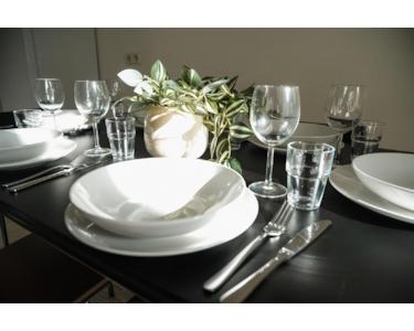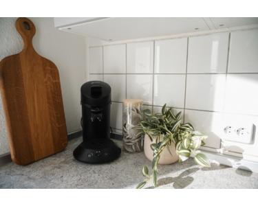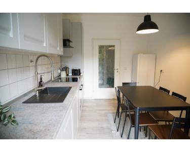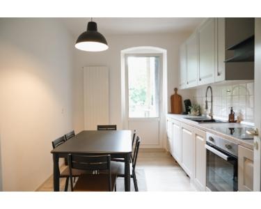 Die moderne, große Küche mit Esstisch, Kaffeemaschine, Toaster und allen Utensilien lädt zum gemeinsamen Kochen ein. Vom Balkon hast du einen ruhigen Blick in den Innenhof.