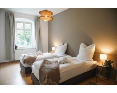 Diese stilvollen Altbauwohnung in Frankfurt (Oder) liegt 2 Gehminuten von der Oder entfernt. Helle Räume, gemütliches Design und flexible Schlafmöglichkeiten machen sie ideal für Freundesgruppen, Geschäftsreisende oder Monteure. Alle Betten sind Einzelbetten und lassen sich zusammen- oder auseinanderschieben. Eine große, voll ausgestattete Küche, Smart TV, Bad mit Wanne sowie ein separates WC sorgen für Komfort. Der Balkon zum Innenhof lädt zum Entspannen ein.